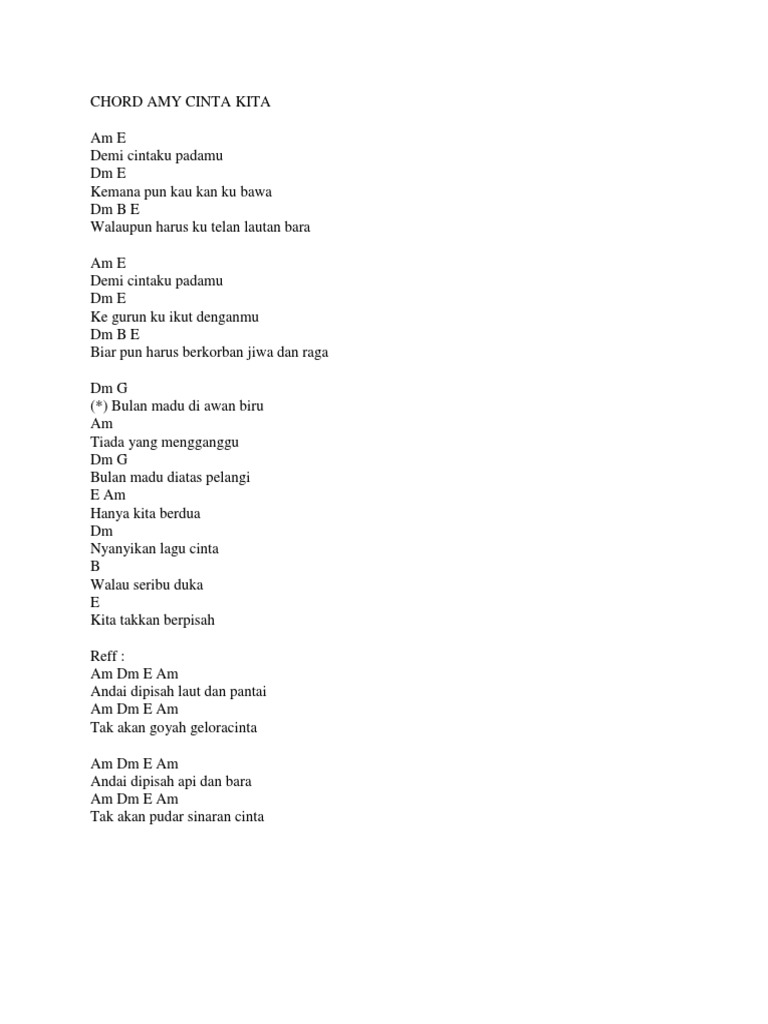 Am em walaupun rintangan datang menduga Penawar hanya dari wajah kekasih. Amy Search feat Inka Cristie - Cinta Kita Demi cintaku padamu Kemana pun kau kan ku bawa Walaupun harus ku telan Lautan bara Demi cintaku padamu Ke gurun ku. Situs chords gitar terlengkap terbaru dan terupdate.