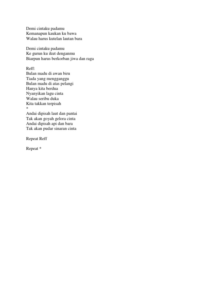 Demi cintaku padamu Ke gurun ku ikut denganmu Biarpun harus berkorban jiwa dan raga. Lautan bara Demi cintaku padamu Ke gurun ku ikut denganmu Biarpun harus berkorban Jiwa dan raga Bulan madu di awan biru Tiada yang mengganggu Bulan madu di atas pelangi. Jangankan harta jiwa ku korbankan.